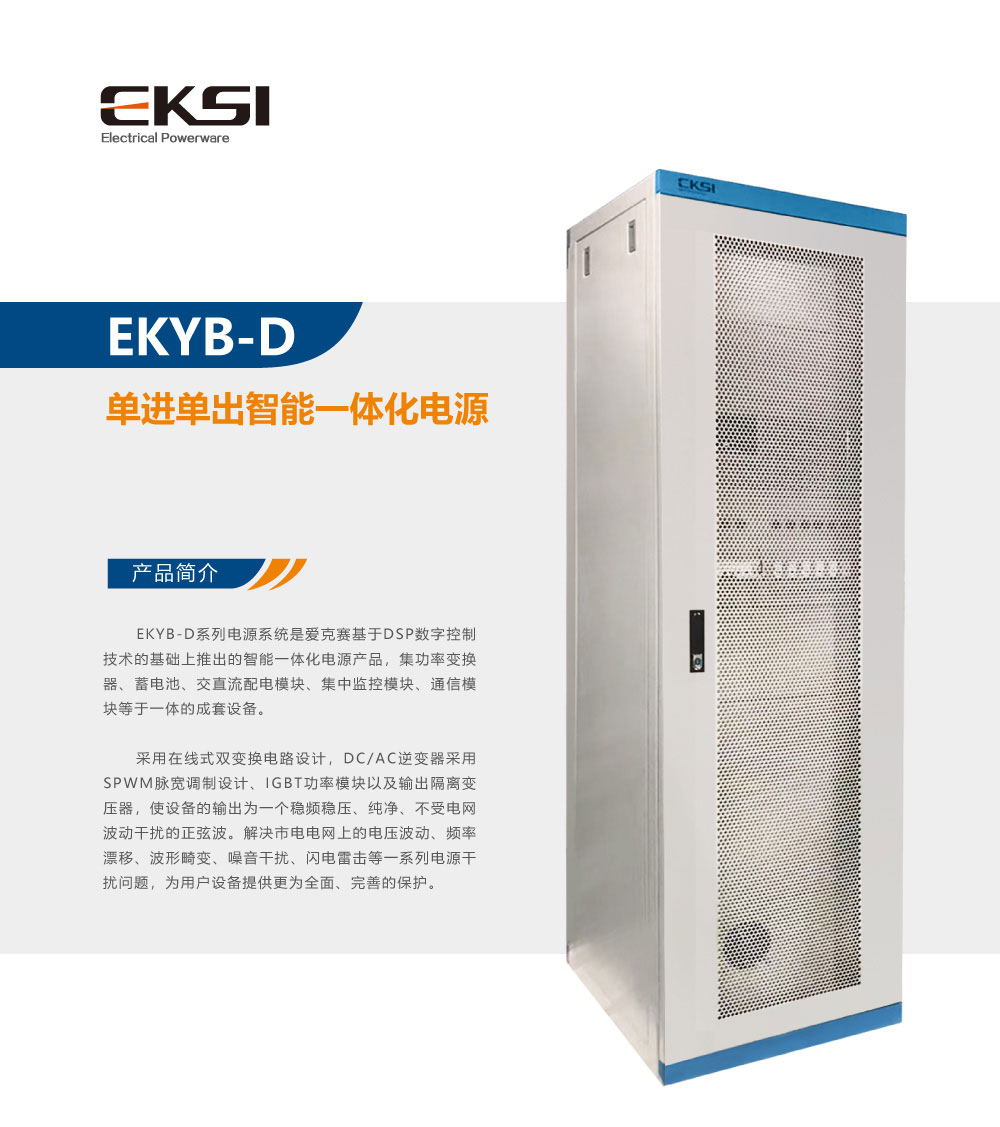 EKYB-D系列電源是單相小功率一體化電源產(chǎn)品,愛克賽基于DSP數(shù)字控制技術(shù)有基礎(chǔ)上推出的智能一體化電源產(chǎn)品,集成了功率變換器、蓄電池、交直流配電模塊、集中監(jiān)控模塊、通信模塊于一體的成套設(shè)備。