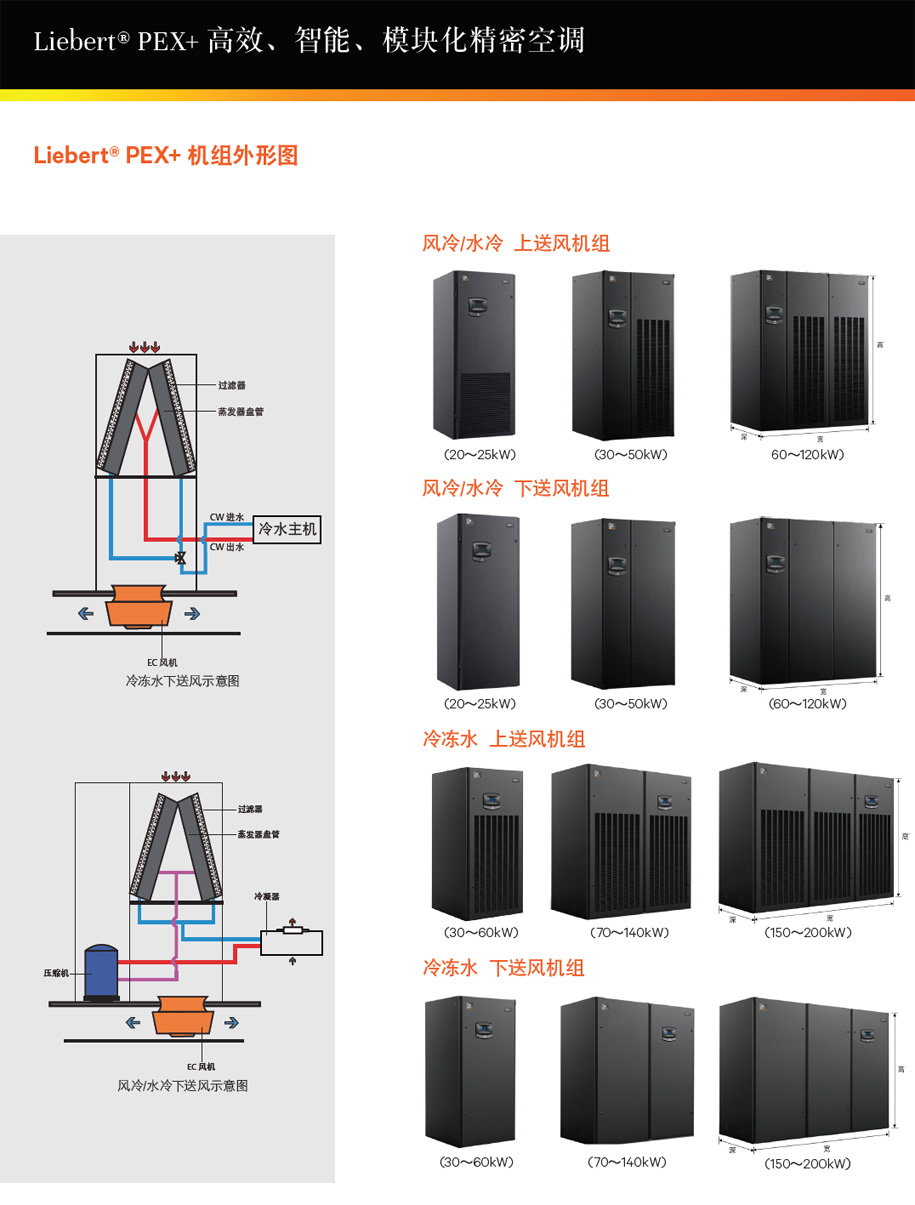 Liebert PEX 機房專用精密空調包括風冷、水冷、乙二醇冷、風冷/冷凍水雙冷源、水冷/冷凍水雙冷源、Free Cooling自然冷、冷凍水、冷凍水雙盤管等多種型式。制冷量范圍寬,風冷、水冷、乙二醇冷機組20kW~100kW,冷凍水機組28-200kW。高可靠性、高靈活性、全壽命成本。完全滿足大,中型交換機房,移動機房,數(shù)據(jù)中心等高標準要求。